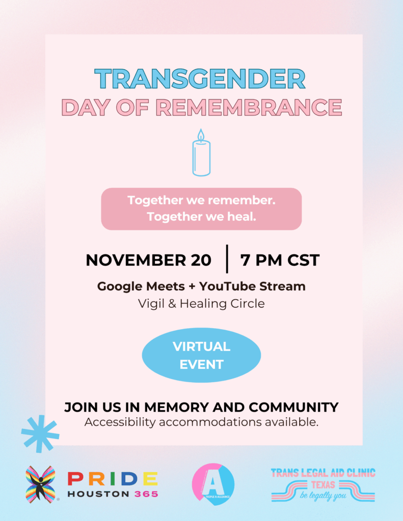 Trans Day of Remembrance is an annual observance honoring the trans and gender-diverse lives lost to violence and discrimination. In 2025, Pride Houston 365 will host a Virtual Vigil & Healing Circle — a trauma-informed, community-led event for collective reflection, remembrance, and resilience. The program unites the LGBTQIA+ community and allies in a space of dignity, empathy, and solidarity.
